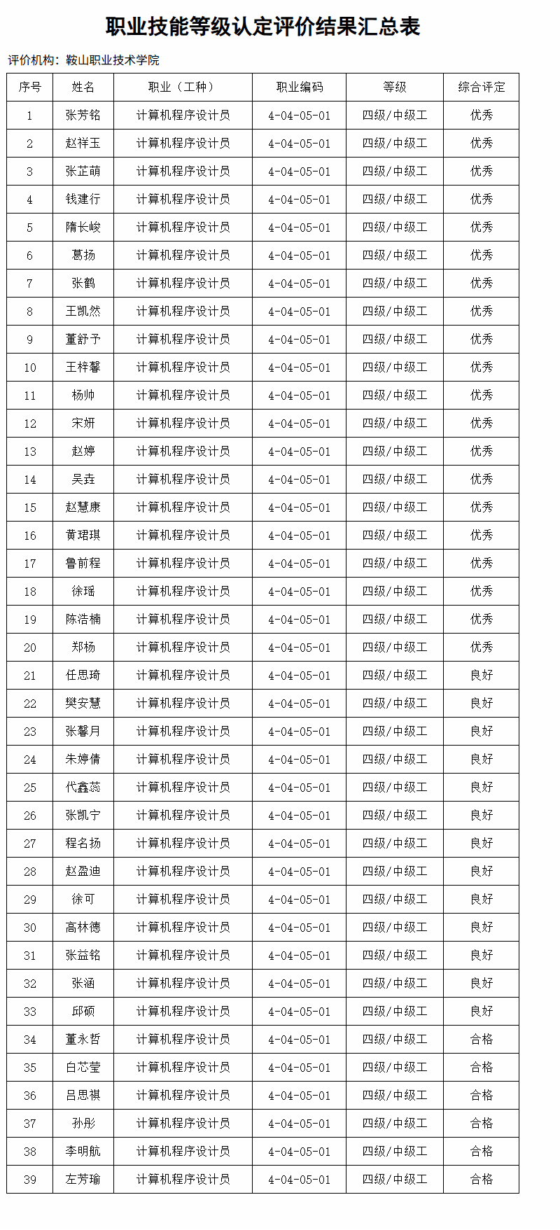 为便于社会监督和信息公开,学院对认定结果进行了汇总。全体考生中共有39人顺利通过认定,合格率达97.5%,其中多名考生在理论与实操环节均表现优异,获得“优秀”评定。该结果充分体现了学院在教学训练和技能考核方面的规范管理与扎实成效。